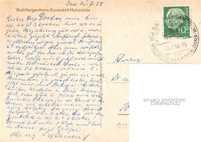 73796007 alte Postkarte Bad Mergentheim Kuranstalt Hohenlohe postalisch gelaufen Erhaltung siehe scans [WerneD78] KatCode: 11110008128007
