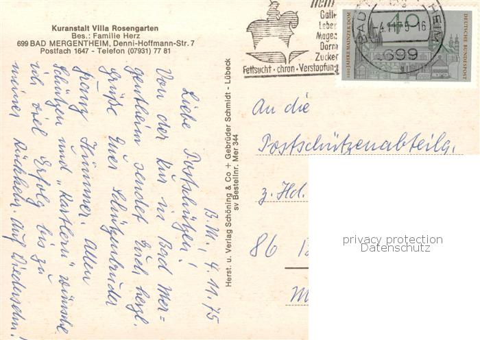 73804389 alte Postkarte Bad Mergentheim Kuranstalt Villa Rosengarten Springbrunnen Gaststube Zimmer postalisch gelaufen Erhaltung siehe scans [WerneD78] KatCode: 11110008128007
