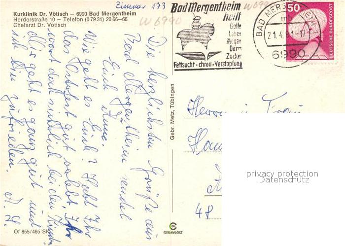 73111884 alte Postkarte Bad Mergentheim Kurklinik Dr. Voetisch postalisch gelaufen Erhaltung siehe scans [NatalD47] KatCode: 11110008128007