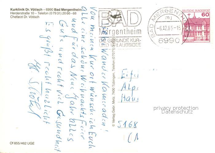 72964700 alte Postkarte Bad Mergentheim Kurklinik Dr Voetisch postalisch gelaufen Erhaltung siehe scans [FriedD77] KatCode: 11110008128007
