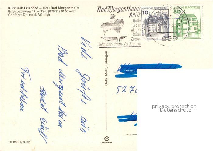 73643602 alte Postkarte Bad Mergentheim Kurklinik Erlenhof Dr Voetisch Hallenbad Gymnastikraum Kegelbahn postalisch gelaufen Erhaltung siehe scans [WerneD78] KatCode: 11110008128007