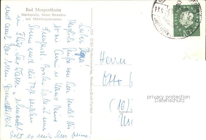 72064283 alte Postkarte Bad Mergentheim Marktplatz Hotel Straussen Milchlingsbrunnen postalisch gelaufen Erhaltung siehe scans KatCode: 11110008128007