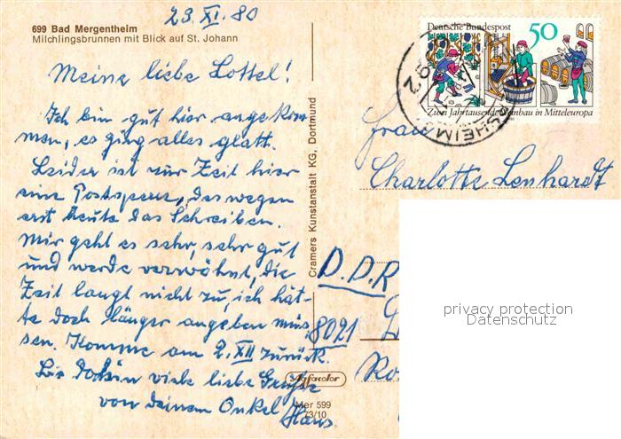 72928862 alte Postkarte Bad Mergentheim Michlingsbrunnen mit Blick auf St Johann Kirche postalisch gelaufen Erhaltung siehe scans [FriedD77] KatCode: 11110008128007