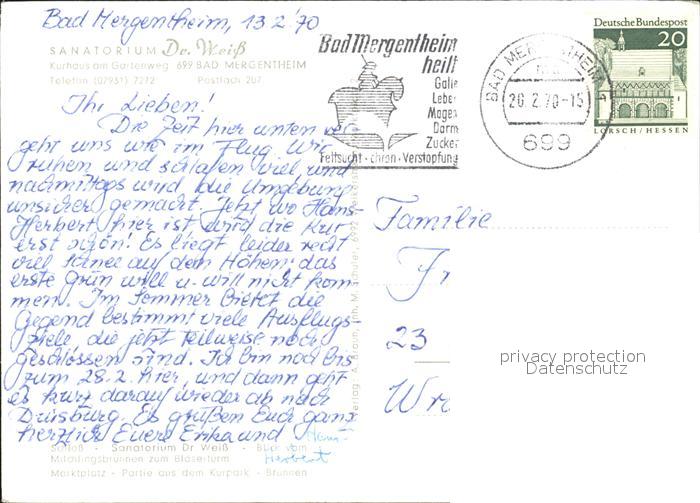 72296252 alte Postkarte Bad Mergentheim Sanatorium Dr. Weiss postalisch gelaufen Erhaltung siehe scans KatCode: 11110008128007
