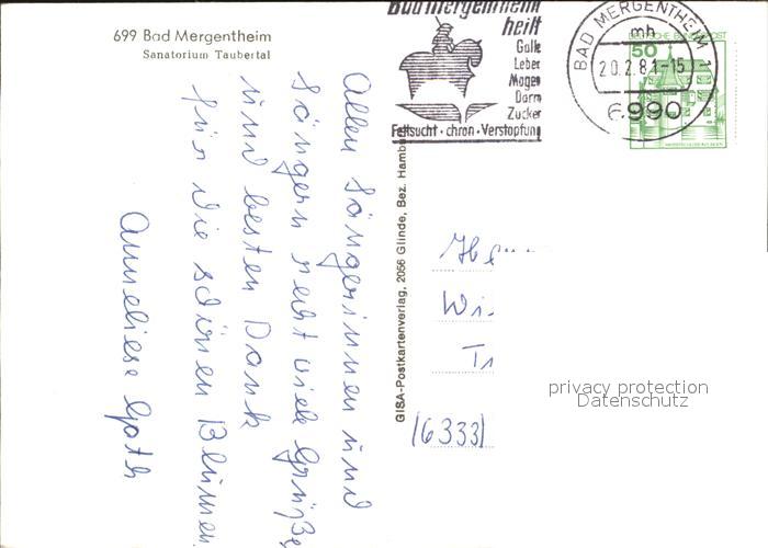 alte Postkarte Bad Mergentheim Sanatorium Taubertal postalisch gelaufen Erhaltung siehe scans