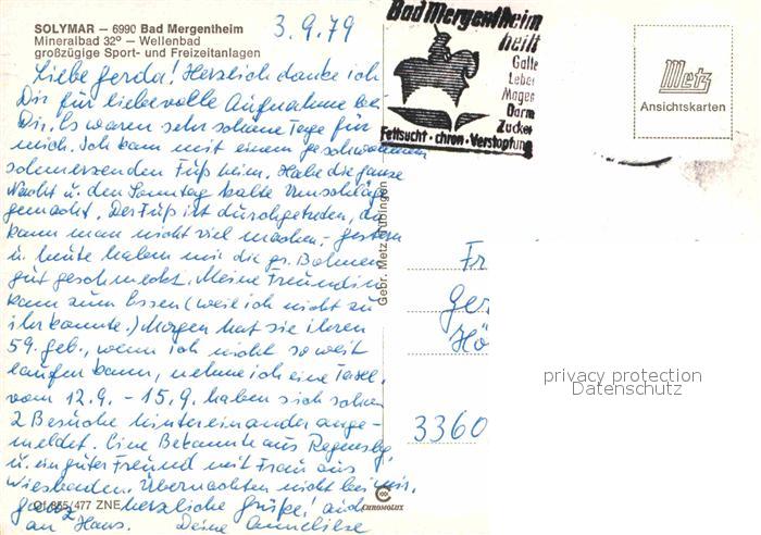 72786092 alte Postkarte Bad Mergentheim Solymar Mineralbad Wellenbad Sport und Freizeitanlagen postalisch gelaufen Erhaltung siehe scans [FriedD77] KatCode: 11110008128007