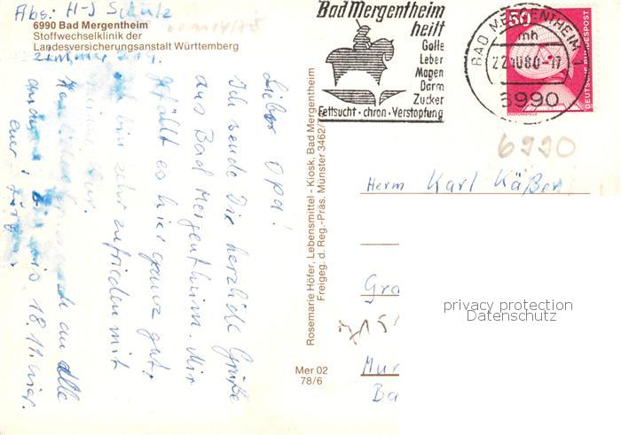 73867265 alte Postkarte Bad Mergentheim Stoffwechselklinik der LVA Wuerttemberg postalisch gelaufen Erhaltung siehe scans [WerneD78] KatCode: 11110008128007