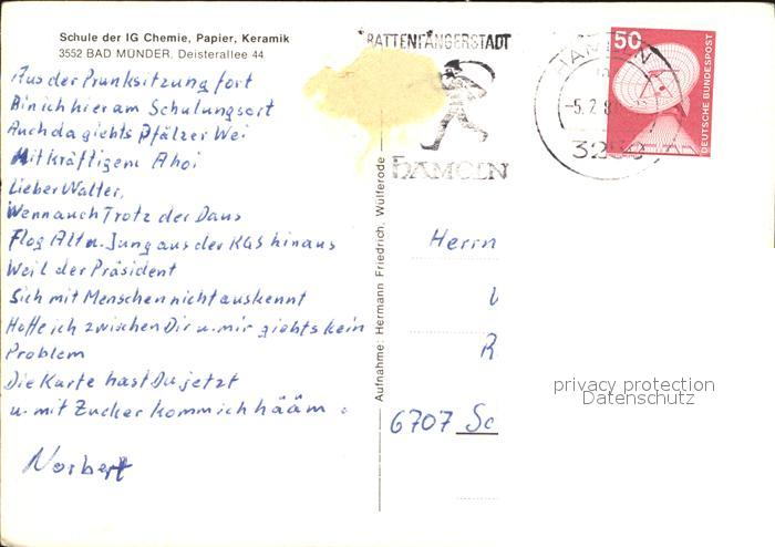 72417382 alte Postkarte Bad Muender Schule der IG Chemie postalisch gelaufen Erhaltung siehe scans KatCode: 11110003252002