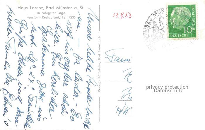 74154218 alte Postkarte Bad Muenster am Stein Ebernburg Rheinland-Pfalz Pension Restaurant Haus Lorenz Blick zur Burg postalisch gelaufen Erhaltung siehe scans [FriedD77] KatCode: 11110007133007