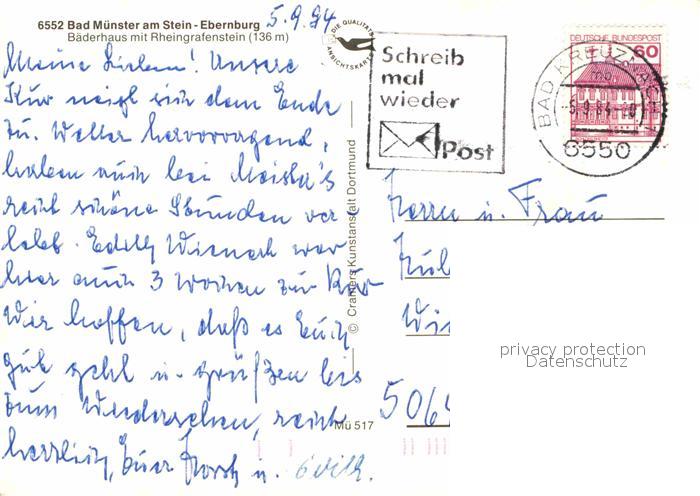 72694608 alte Postkarte Bad Muenster Stein Ebernburg Baederhaus mit Rheingrafenstein Felsen postalisch gelaufen Erhaltung siehe scans [FriedD77] KatCode: 11110007133007
