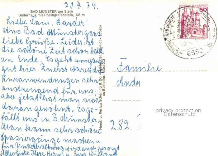 72904240 alte Postkarte Bad Muenster Stein Ebernburg Baederhaus Rheingrafenstein postalisch gelaufen Erhaltung siehe scans [NatalD47] KatCode: 11110007133007