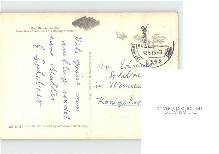 72185039 alte Postkarte Bad Muenster Stein Ebernburg Rotenfels Baederhaus Rheingrafenstein postalisch gelaufen Erhaltung siehe scans KatCode: 11110007133007
