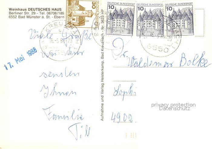 73169486 alte Postkarte Bad Muenster Stein Ebernburg Weinhaus Deutsches Haus Restaurant Wappen postalisch gelaufen Erhaltung siehe scans [FriedD77] KatCode: 11110007133007