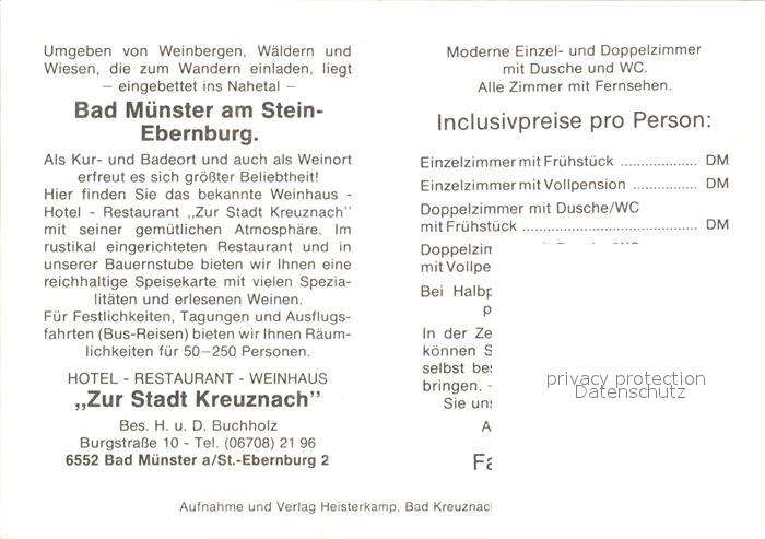 72567694 Bad Muenster Stein Ebernburg Weinhaus Hotel Restaurant Zur Stadt Kreuznach postalisch nicht gelaufen Werbekarte (keine Postkarte) Erhaltung siehe scans [KathaD79] KatCode: 11110007133007