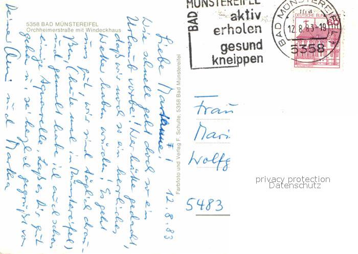 72866683 alte Postkarte Bad Muenstereifel Orchheimerstrasse Windeckhaus postalisch gelaufen Erhaltung siehe scans [NatalD47] KatCode: 11110005366004