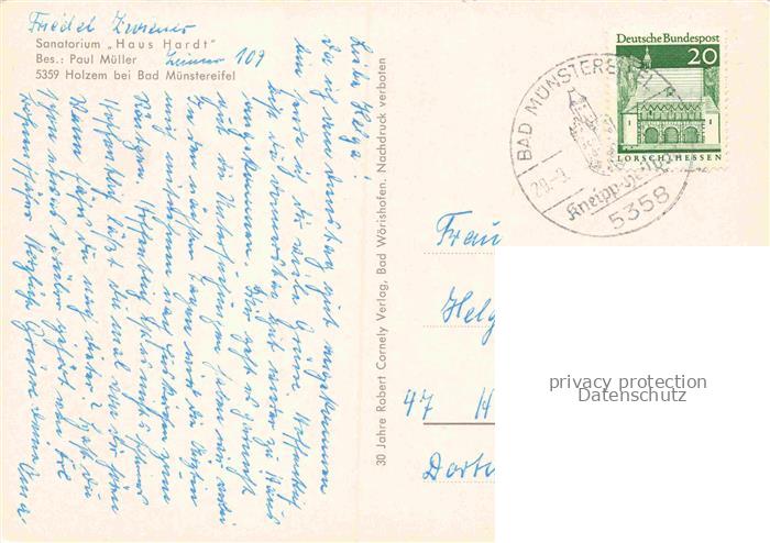74023757 alte Postkarte Bad Muenstereifel Sanatorium Haus Hardt Parkanlagen Landschaftspanorama postalisch gelaufen Erhaltung siehe scans [FriedD77] KatCode: 11110005366004
