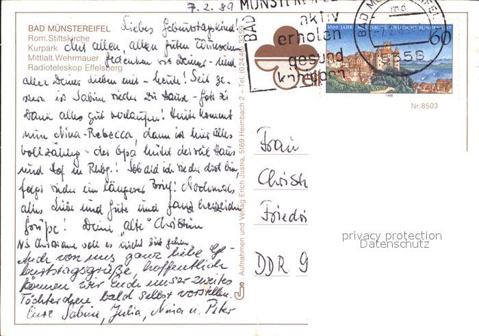 72448640 alte Postkarte Bad Muenstereifel Stiftskirche Kurpark Wehrmauer Radioteleskop Effelsberg postalisch gelaufen Erhaltung siehe scans KatCode: 11110005366004
