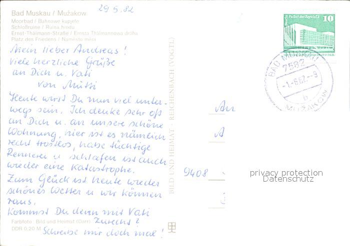 72382536 alte Postkarte Bad Muskau Oberlausitz Schlossruine Ernst-Thaelmann-Strasse Platz des Friedens postalisch gelaufen Erhaltung siehe scans KatCode: 11110014284010