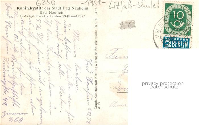 73694506 alte Postkarte Bad Nauheim Konitzkystift Litfass-Saeule postalisch gelaufen Erhaltung siehe scans [FriedD77] KatCode: 11110006440002