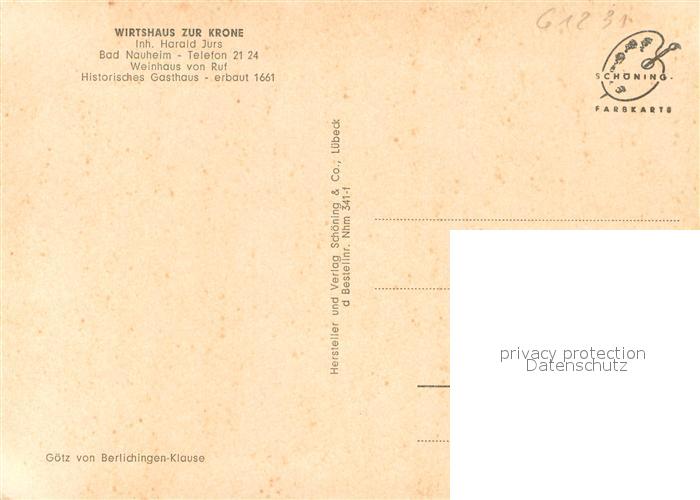 73642158 Bad Nauheim Wirtshaus zur Krone postalisch nicht gelaufen Erhaltung siehe scans [WerneD78] KatCode: 11110006440002