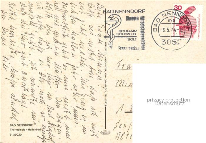 73103168 alte Postkarte Bad Nenndorf Thermalsole Hallenbad postalisch gelaufen Erhaltung siehe scans [WerneD78] KatCode: 11110003257006