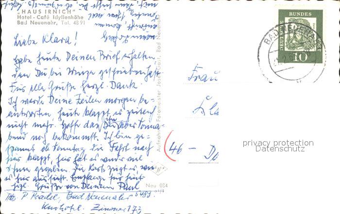 71929812 alte Postkarte Bad Neuenahr-Ahrweiler Haus Irnich Hotel Cafe Idyllenhoehe postalisch gelaufen Erhaltung siehe scans KatCode: 11110007131007