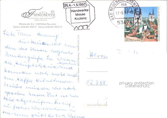 72222546 alte Postkarte Bad Neuenahr-Ahrweiler Hotel Fuerstenberg Restaurant postalisch gelaufen Erhaltung siehe scans KatCode: 11110007131007
