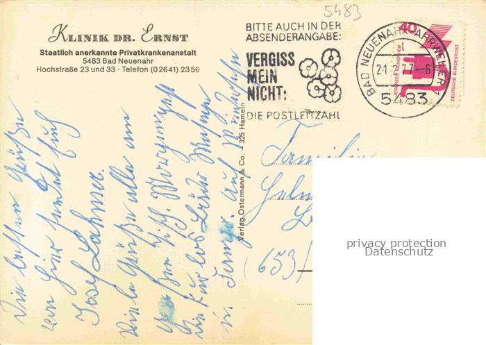 74054048 alte Postkarte BAD NEUENAHR-AHRWEILER Klinik Dr. Ernst postalisch gelaufen Erhaltung siehe scans [FriedD77] KatCode: 11110007131007