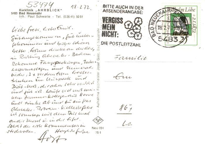 73872219 alte Postkarte Bad Neuenahr-Ahrweiler Kurklinik Ahrblick postalisch gelaufen Erhaltung siehe scans [FriedD77] KatCode: 11110007131007