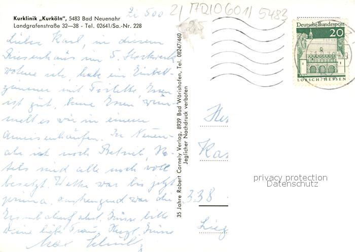 73165459 alte Postkarte Bad Neuenahr-Ahrweiler Kurklinik Kurkoeln postalisch gelaufen Erhaltung siehe scans [KathaD81] KatCode: 11110007131007