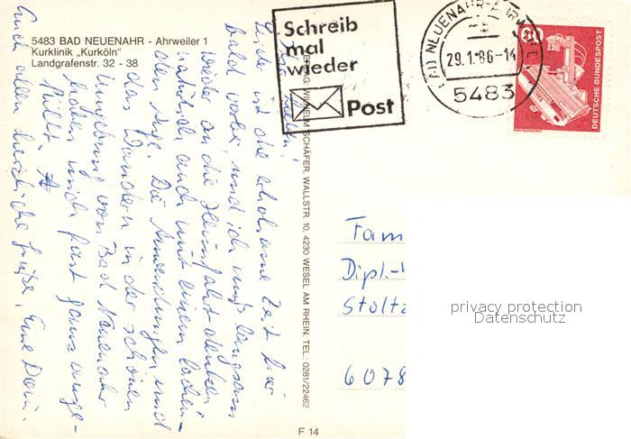 73101708 alte Postkarte Bad Neuenahr-Ahrweiler Kurklinik Kurkoeln postalisch gelaufen Erhaltung siehe scans [WerneD78] KatCode: 11110007131007