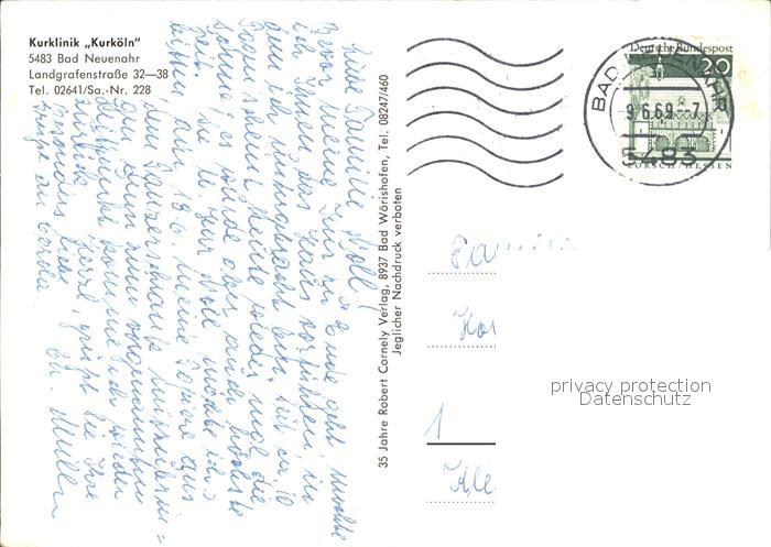72285816 alte Postkarte Bad Neuenahr-Ahrweiler Kurklinik Kurkoeln postalisch gelaufen Erhaltung siehe scans KatCode: 11110007131007