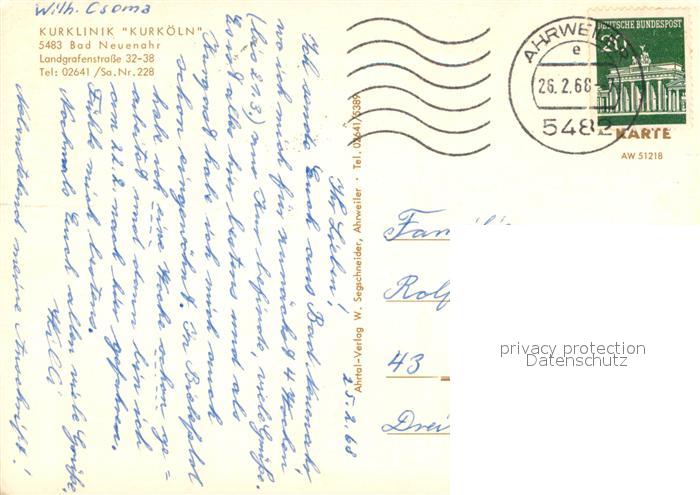 73176103 alte Postkarte Bad Neuenahr-Ahrweiler Kurklinik Kurkoeln postalisch gelaufen Erhaltung siehe scans [NatalD47] KatCode: 11110007131007