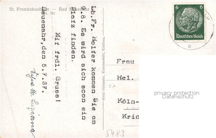 73802137 alte Postkarte Bad Neuenahr-Ahrweiler St. Franziskusheim postalisch gelaufen Erhaltung siehe scans [FriedD77] KatCode: 11110007131007