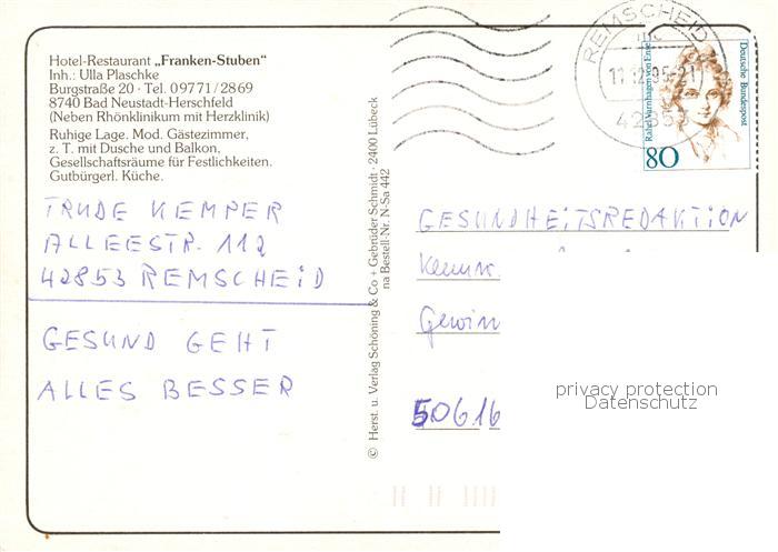 73845657 alte Postkarte Bad Neustadt Hotel Restaurant Franken Stuben Gastraeume postalisch gelaufen Erhaltung siehe scans [FriedD77] KatCode: 11110009673114