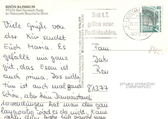 73777542 alte Postkarte Bad Neustadt Rhoen Klinikum im Naturpark Bayerische Rhoen Luftbild postalisch gelaufen Erhaltung siehe scans [FriedD77] KatCode: 11110009673114