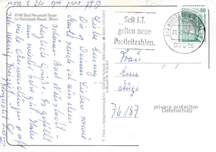 74055351 alte Postkarte Bad Neustadt Saale Bayern Marktplatz Brunnen Schloss Sole-Bewegungsbad Spoerleinstrasse Trinkkur Kurkonzert Kurpark Illumination postalisch gelaufen Erhaltung siehe scans [FriedD77] KatCode: 11110009673114