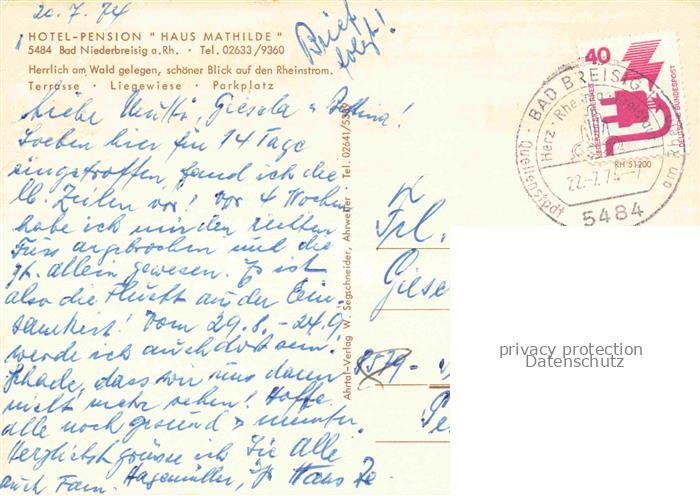 74053269 alte Postkarte Bad Niederbreisig Hotel Pension Haus Mathilde Gartenterrasse postalisch gelaufen Erhaltung siehe scans [FriedD77] KatCode: 11110007131006