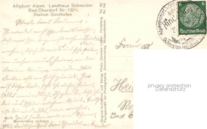 43039162 alte Postkarte Bad Oberdorf Landhaus Schneider Allgaeuer Alpen postalisch gelaufen Erhaltung siehe scans [FriedD77] KatCode: 11110009780123