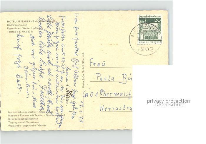 71850767 alte Postkarte Bad Oeynhausen Hotel Restaurant Hahnenkamp postalisch gelaufen Erhaltung siehe scans KatCode: 11110005770004