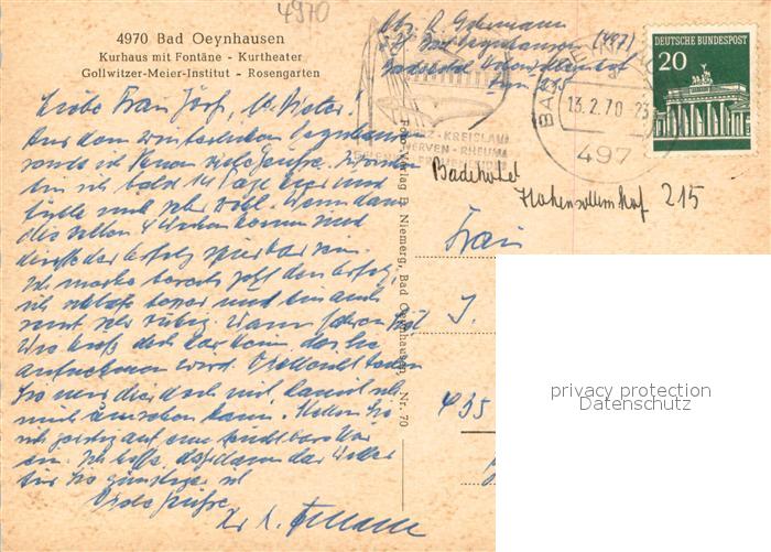 73695070 alte Postkarte Bad Oeynhausen Kurhaus mit Fontaene Kurtheater Gollwitzer Meier Institut Rosengarten postalisch gelaufen Erhaltung siehe scans [WerneD78] KatCode: 11110005770004