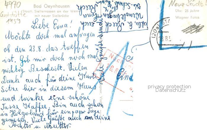 73694015 alte Postkarte Bad Oeynhausen Sielterrassen an der Werra mit neuer Sielbruecke postalisch gelaufen Erhaltung siehe scans [WerneD78] KatCode: 11110005770004
