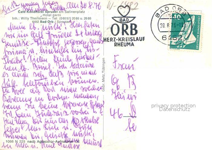 72903460 alte Postkarte Bad Orb Cafe Konditorei Sprudel Salinenplatz Wasserspiele postalisch gelaufen Erhaltung siehe scans [FriedD77] KatCode: 11110006435001