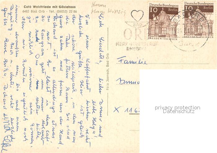 73652873 alte Postkarte Bad Orb Cafe Waldfriede mit Gaestehaus postalisch gelaufen Erhaltung siehe scans [FriedD77] KatCode: 11110006435001