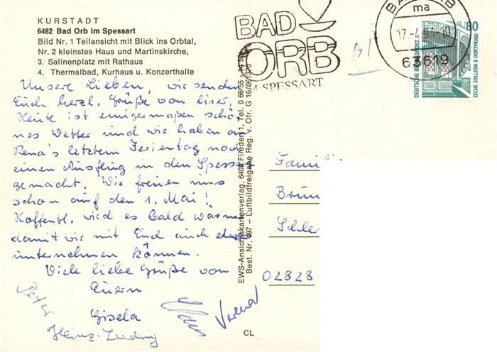 73881331 alte Postkarte Bad Orb Fliegeraufnahme kleinstes Haus Martinskirche Salinenplatz Rathaus Thermalbad Kurhaus Konzerthalle postalisch gelaufen Erhaltung siehe scans [WerneD78] KatCode: 11110006435001