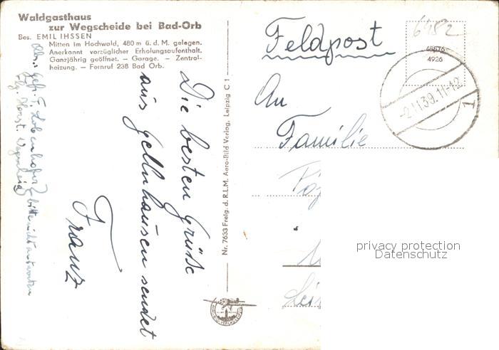 31721495 alte Postkarte Bad Orb Fliegeraufnahme Waldgasthaus zur Wegscheide postalisch gelaufen Feldpost Erhaltung siehe scans KatCode: 11110006435001