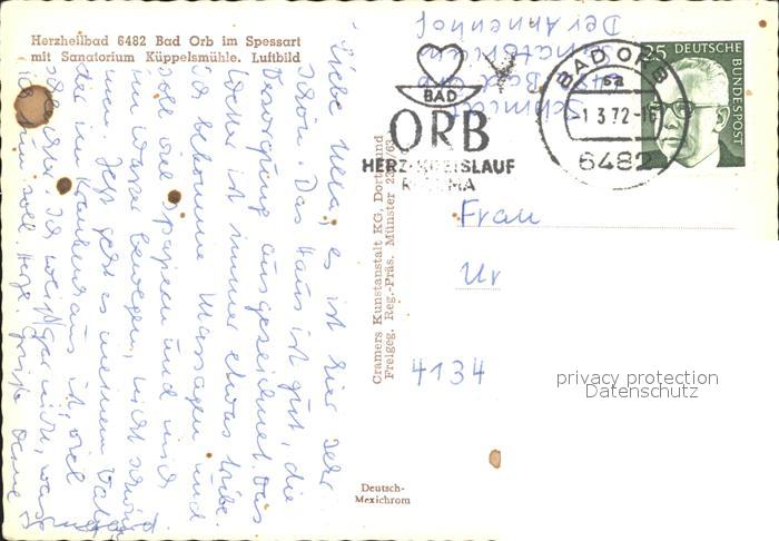 72263120 alte Postkarte Bad Orb Heilbad im Spessart Sanatorium Kueppelsmuehle Fliegeraufnahme postalisch gelaufen Erhaltung siehe scans KatCode: 11110006435001