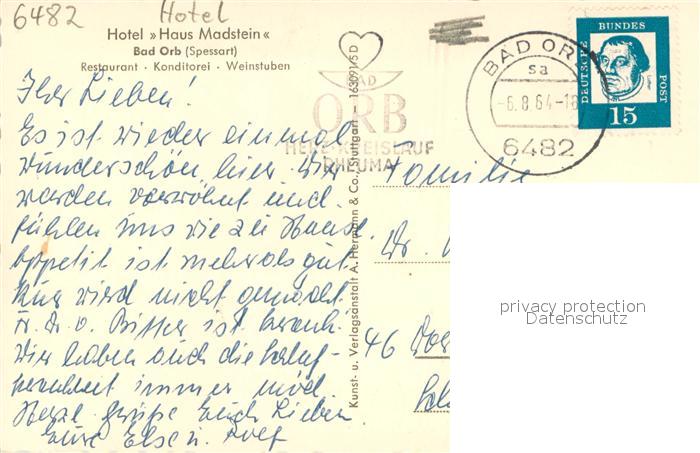 73706354 alte Postkarte Bad Orb Hotel Haus Madstein Kerzenstuberl postalisch gelaufen Erhaltung siehe scans [LiesaD40] KatCode: 11110006435001