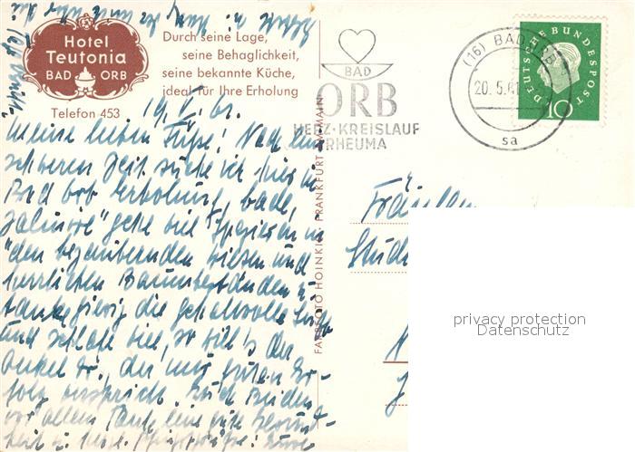 33046576 alte Postkarte Bad Orb Hotel Teutonia postalisch gelaufen Erhaltung siehe scans [NatalD47] KatCode: 11110006435001