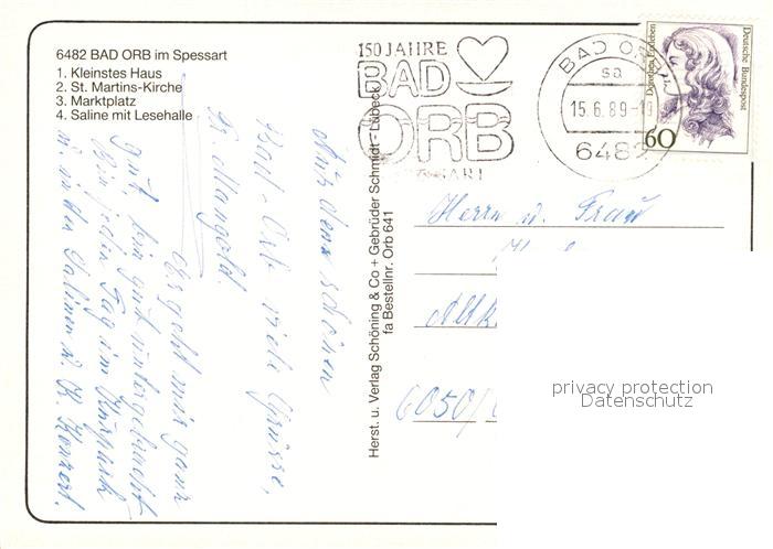 73240501 alte Postkarte Bad Orb Kleinstes Haus Martins Kirche Marktplatz Saline Lesehalle postalisch gelaufen Erhaltung siehe scans [KathaD81] KatCode: 11110006435001